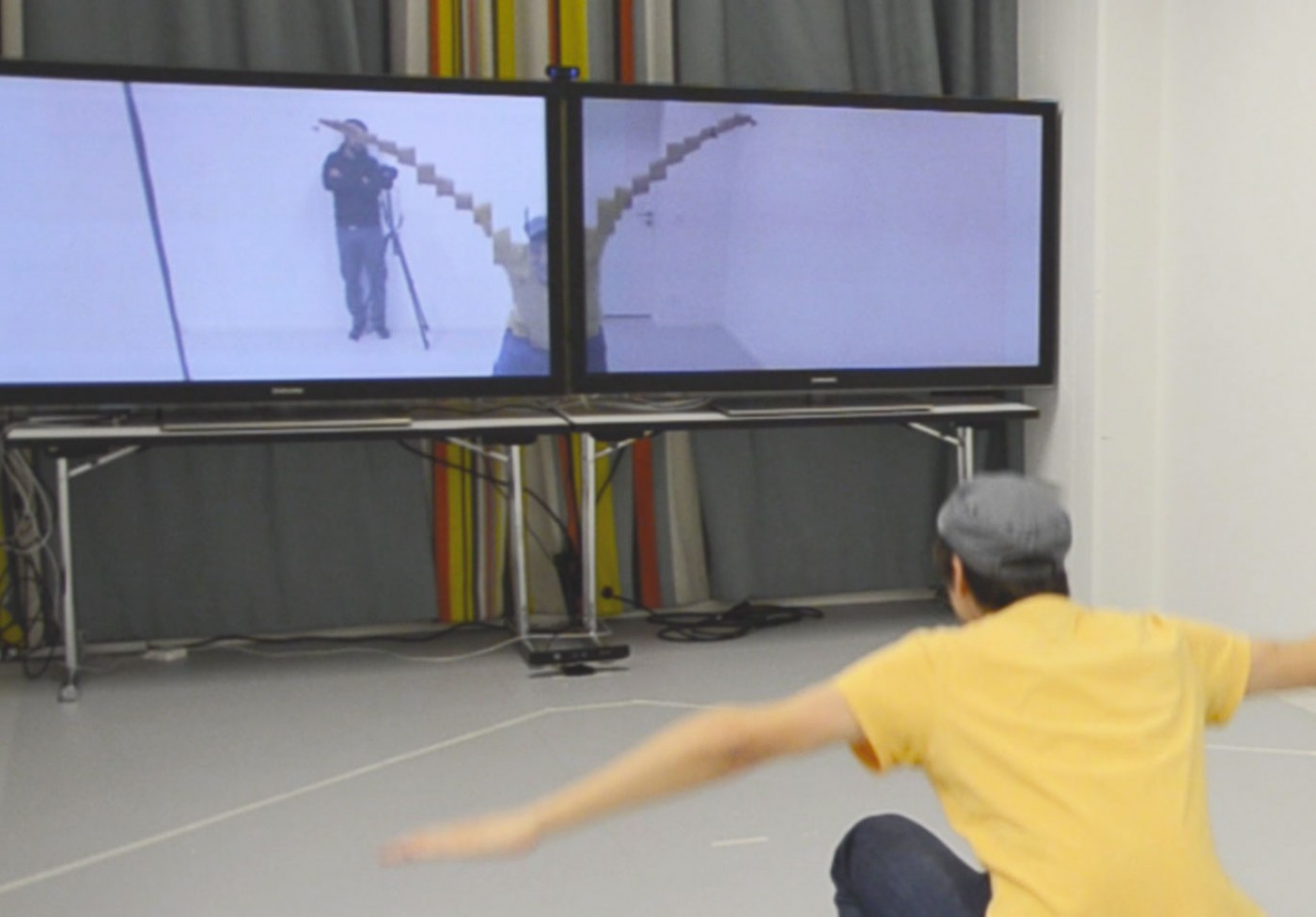 Die Installation besteht aus einem Panoramaspiegel (zwei Monitore), einer Webcam und einer Kinect. Je nach Position im Raum verändert sich die Verzerrung und die Verzögerung.